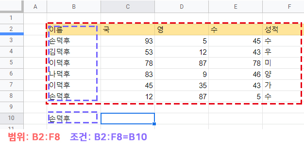 - 조건(B2:F8=B10): 조건에 대해 좀 더 익숙해질 필요가 있습니다. 조건은 <.>.= 등의 기로호 내 생각을 조건으로 만드는 연습이 필요해요. 즉, "B열에 있는 데이터 중 손덕후랑 같은 단어 찾아!"가 이 식의 조건입니다.
